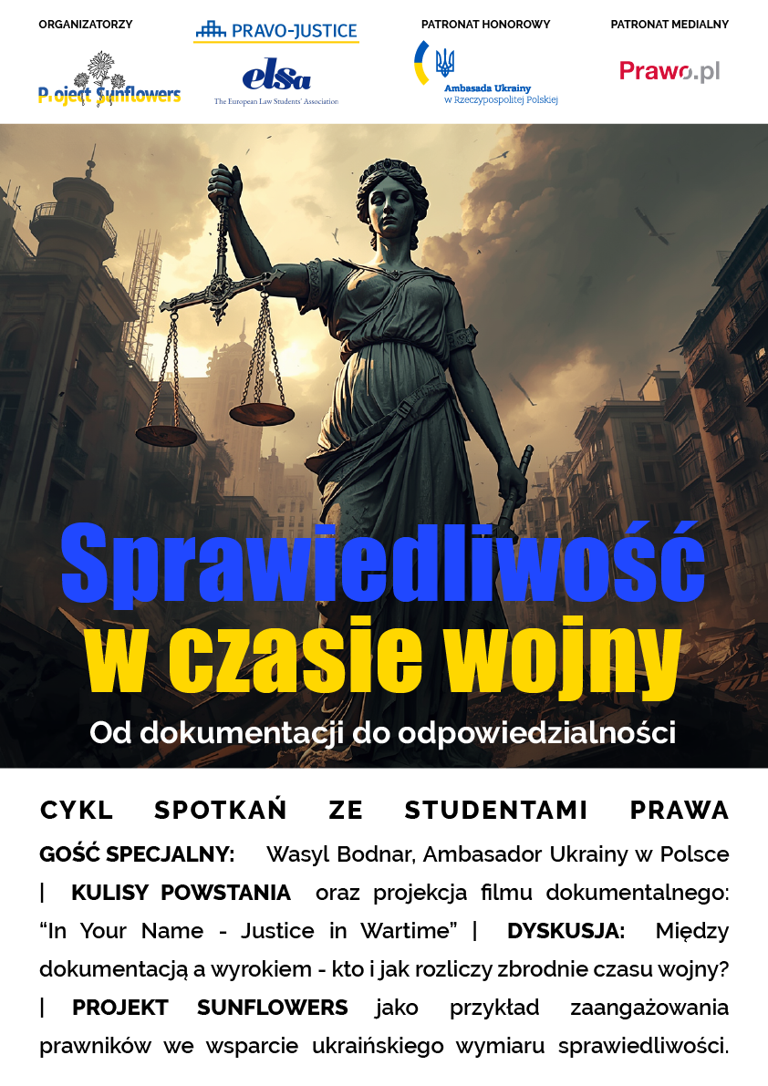 The series is held under the honorary patronage of the Ambassador of Ukraine to Poland, Mr. Vasyl Bodnar, highlighting the importance and timeliness of the initiative. Co-organizers of the series of events are the EU Project Pravo-Justice (producer of the documentary), Wolters Kluwer Polska and European Law Students’ Association ELSA-Poland. The media patron of the initiative is Prawo.pl.